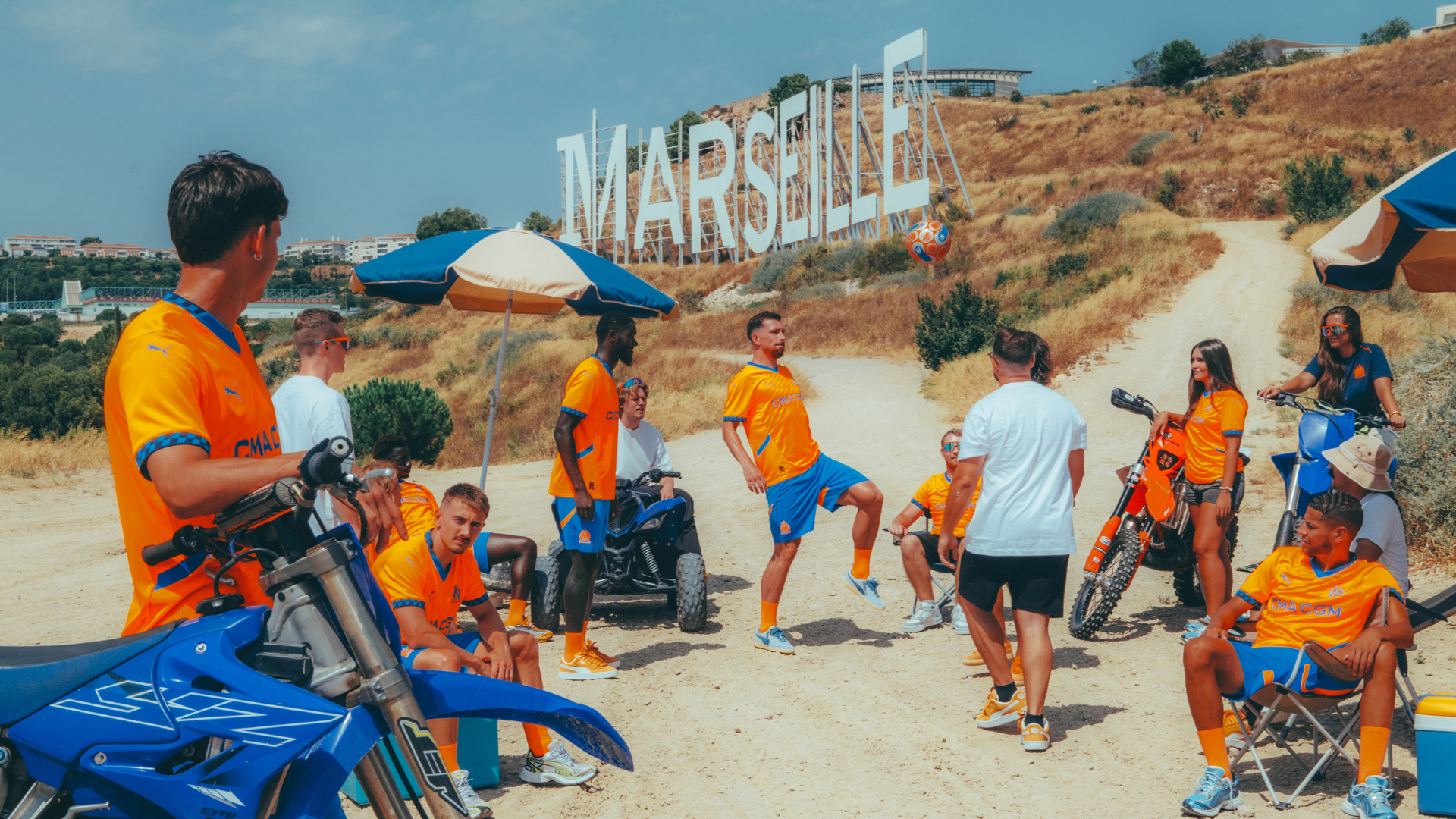 Pour le lancement, joueurs et supporters se sont réunis au pied des lettres géantes de Marseille, un lieu emblématique de la ville, pour dévoiler ce nouveau maillot. Cette scène a capturé l’essence de l’OM avec une touche de convivialité et de simplicité, grâce à des chaises pliantes et une glacière. Ce moment de partage, célébrant le sport et la ville, reflète parfaitement l’esprit communautaire et chaleureux qui anime Marseille.